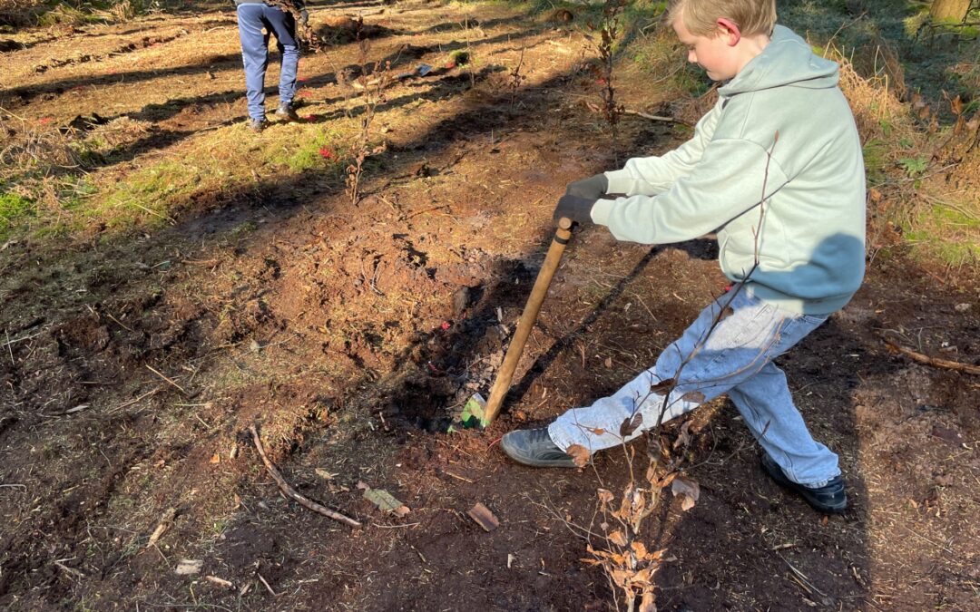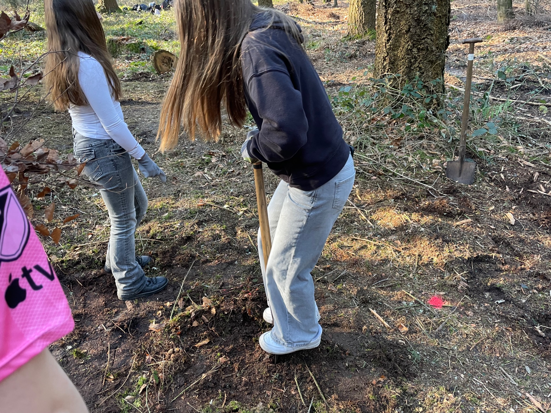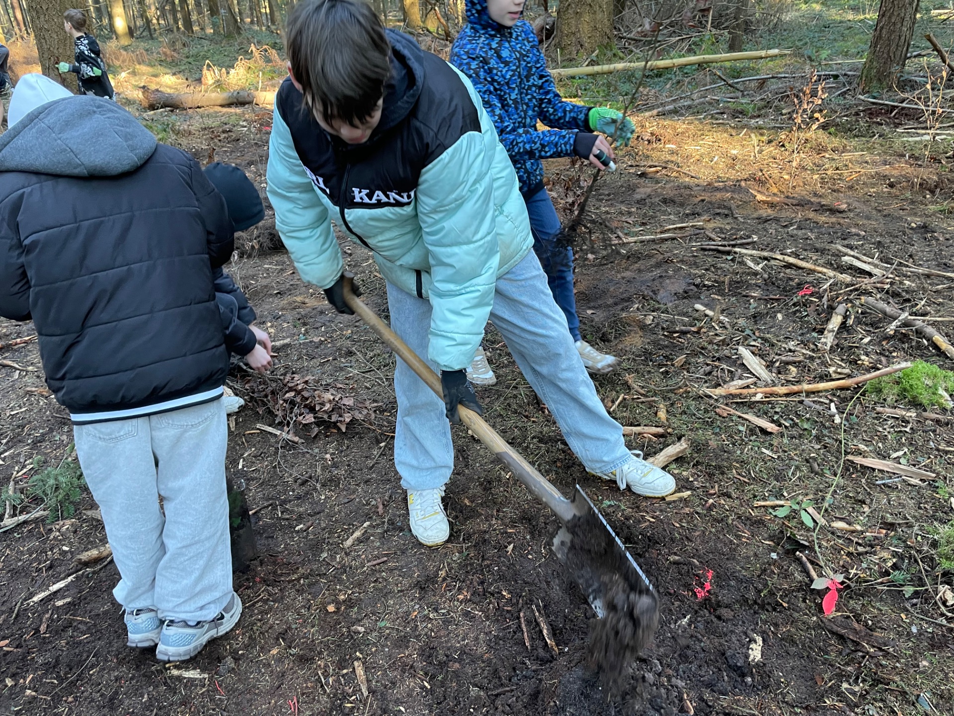 Die Klasse 7c und ein Biologiekurs machten sich auf den Weg in den Reichswald am Treppkesweg. Treffpunkt war der Waldparkplatz in Materborn. Von dort aus wanderten die Schülerinnen und Schüler gemeinsam zur Pflanzstelle. Unterstützt und angeleitet wurden sie vom Förster Joachim Böhmer sowie drei Forstwirten. Besonders schön war, dass sich unter ihnen auch ein ehemaliger Schüler der KKRS befand. Außerdem half ein Vater tatkräftig mit. Mit viel Engagement pflanzten die Schülerinnen und Schüler junge Buchen und Eichen. Dabei erfuhren sie auch, warum diese Baumarten wichtig für einen stabilen und vielfältigen Wald sind. Zwischen der Arbeit blieb natürlich Zeit für eine kurze Pause, um sich zu stärken. Am Ende konnten alle stolz auf die vielen neu gepflanzten Bäume blicken, die künftig zum Wachstum des Waldes beitragen werden.
