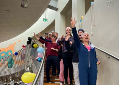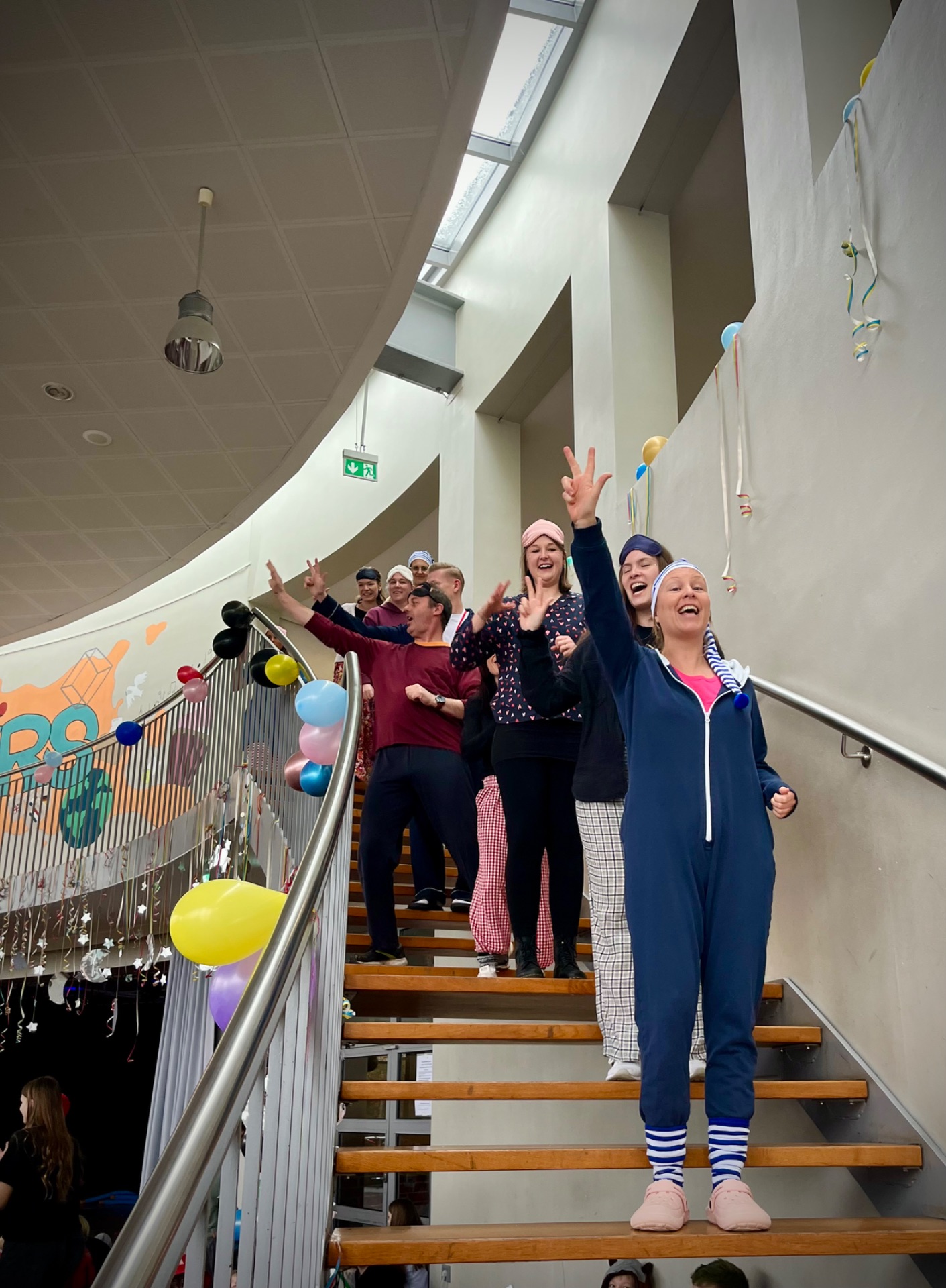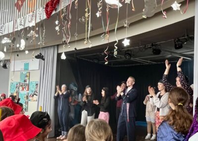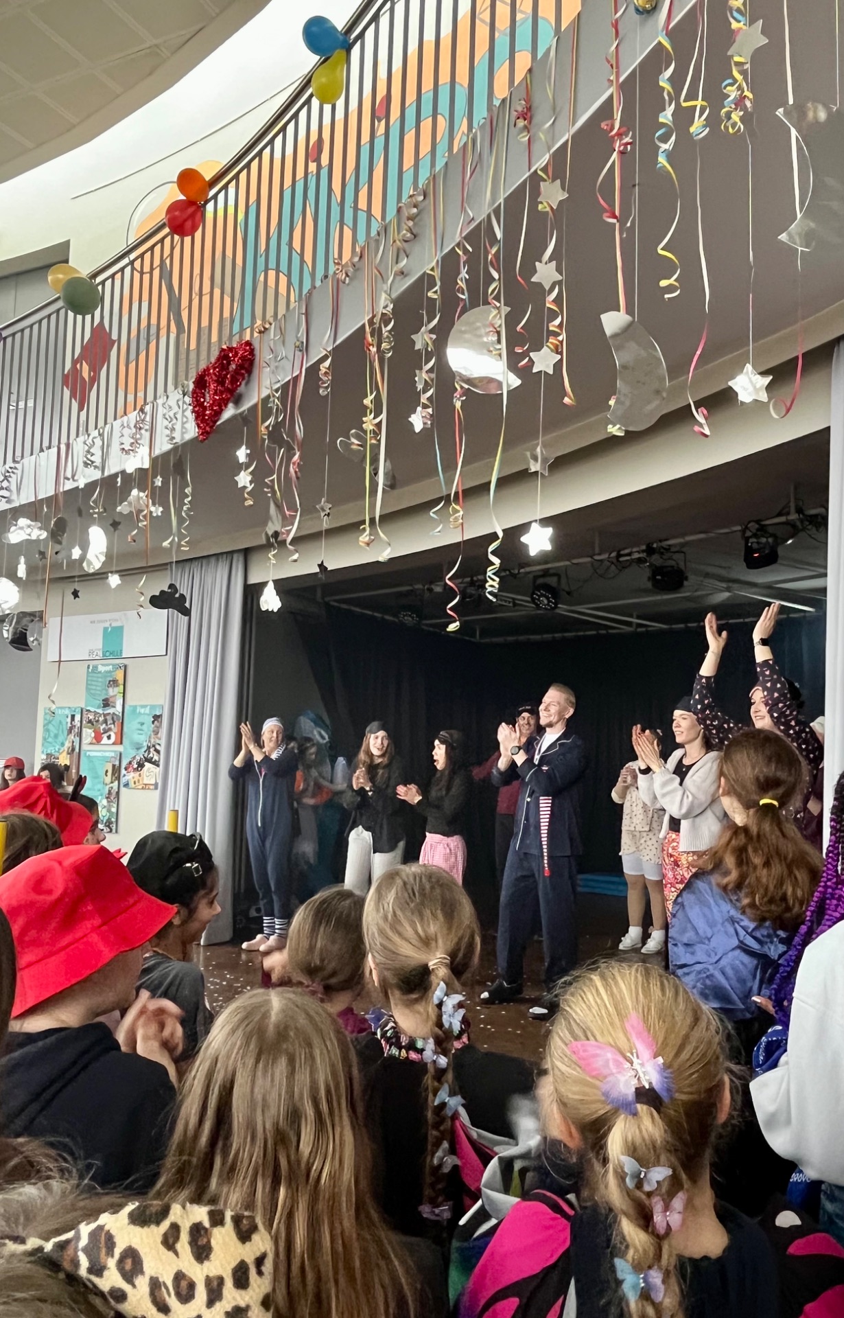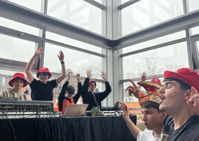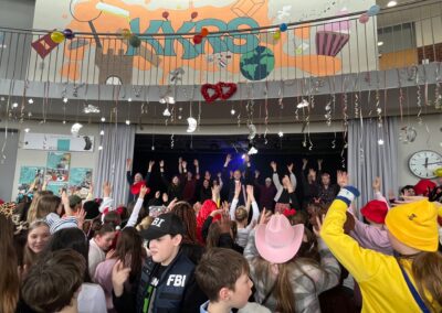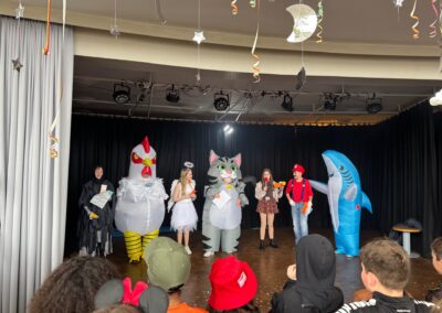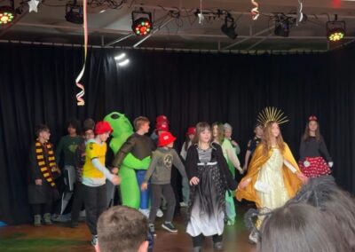 In diesem Jahr feierten die Jahrgänge 5 bis 7 gemeinsam und sorgten für eine besonders fröhliche Atmosphäre. Ein echtes Highlight war der Besuch des Klever Karnevalsprinzen Prinz Tobi der Träumende, der zusammen mit seiner Garde für begeisterten Applaus sorgte. Spätestens beim eingeübten Prinzenlied, das lautstark mitgesungen wurde, erreichte die Stimmung ihren Höhepunkt. Auch kulinarisch kamen alle auf ihre Kosten. Frischgebackene Waffeln und Donuts sorgten für neue Energie zwischen den Programmpunkten. Auf der Bühne folgten zahlreiche Auftritte verschiedener Klassen. Von mitreißenden Tänzen bis hin zu beeindruckenden Gesangseinlagen war alles dabei. Besonders gespannt warteten viele auf den traditionellen Tanz des Lehrerkollegiums, der auch dieses Jahr für viele Lacher und großen Jubel sorgte. Ein weiterer Höhepunkt war der Kostümwettbewerb. Bereits im Klassenlehrerunterricht hatten die Klassen ihre drei besten Kostüme ausgewählt. Diese traten anschließend im schulweiten Wettbewerb gegeneinander an.