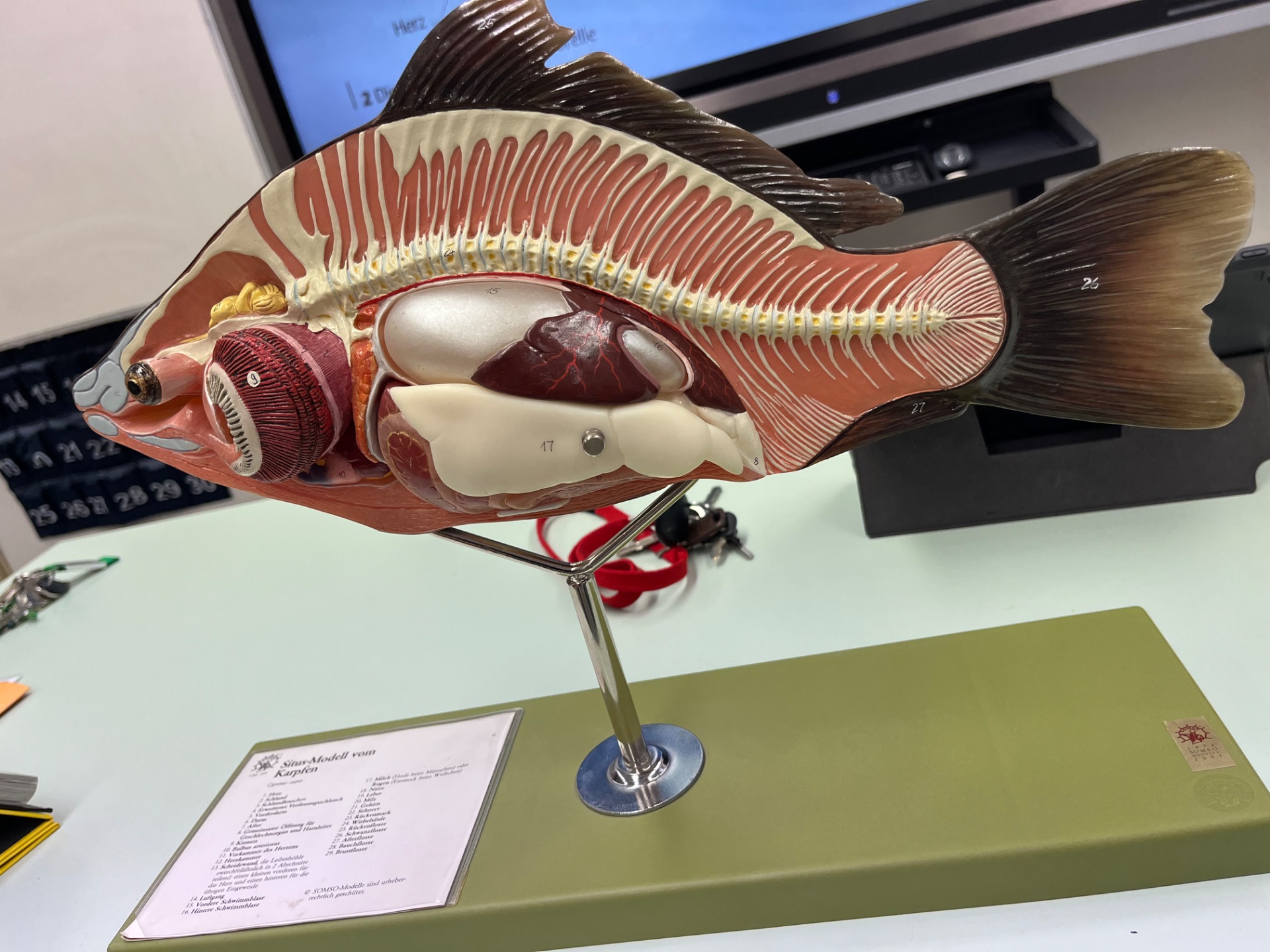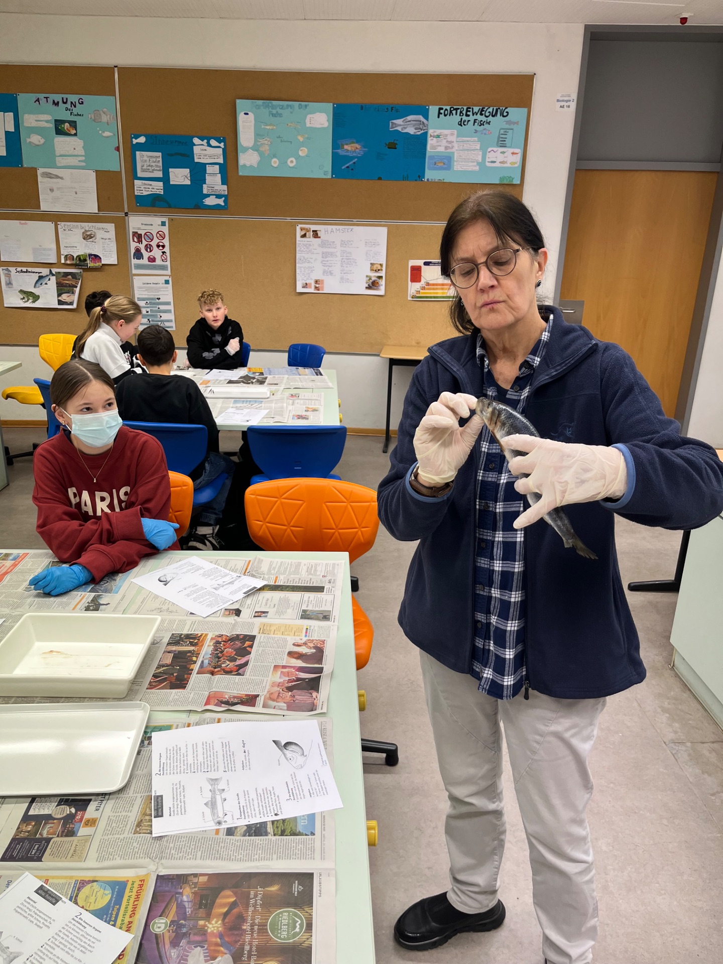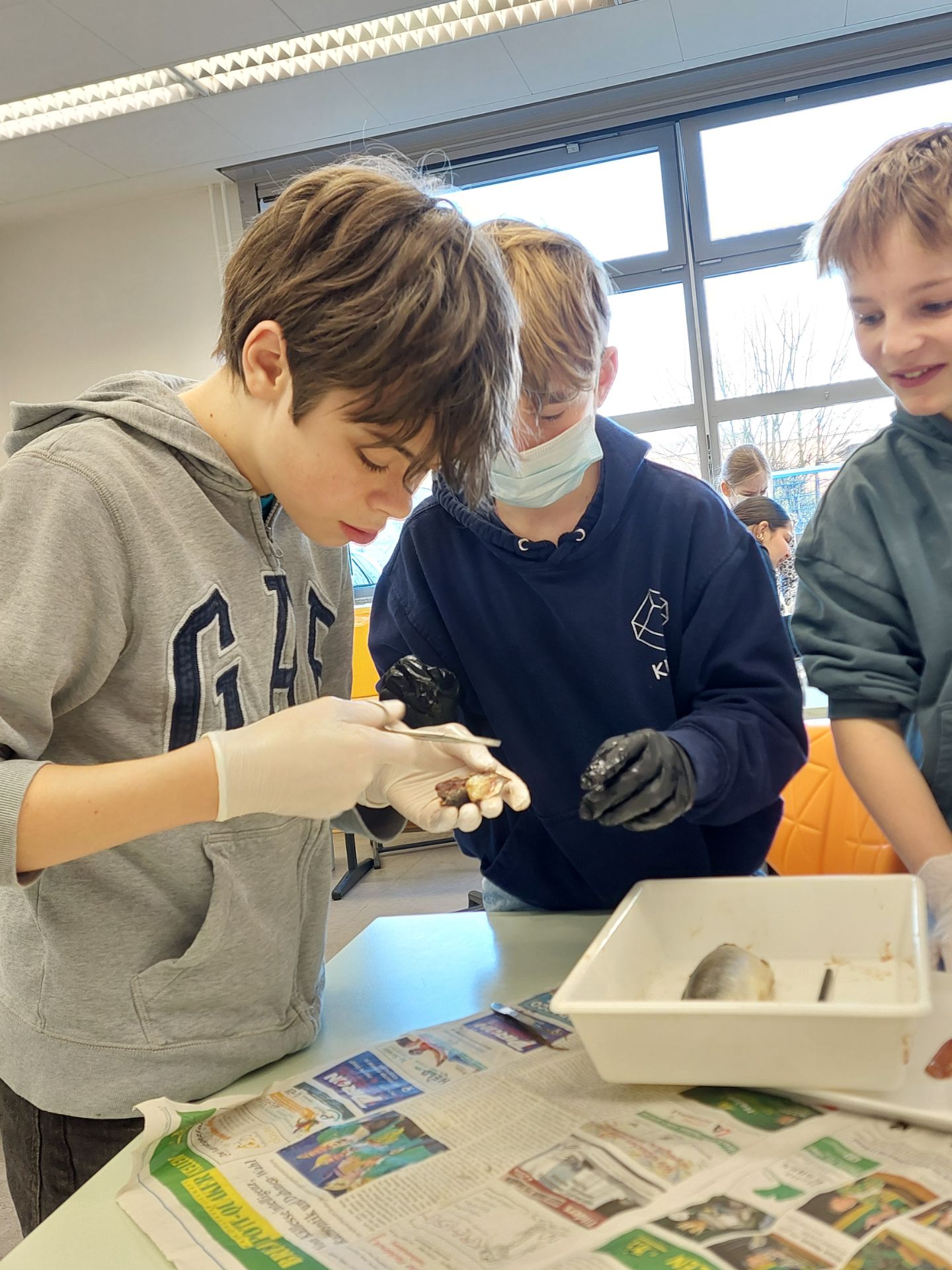 An jedem Tisch arbeiteten vier Schülerinnen und Schüler zusammen. Ausgerüstet mit scharfen Scheren, Pinzetten, Präpariernadeln, Einmalhandschuhen und Lupen ging es vorsichtig ans Werk. Einige trugen sogar Masken, um den typischen Fischgeruch etwas zu reduzieren. Nach einer kurzen Phase der Überwindung wurden die Heringe schließlich ganz professionell geöffnet und untersucht. Schon bald entdeckten die jungen Forscher wichtige Organe wie die Schwimmblase, den Magen, die Geschlechtsorgane und die Kiemen. Besonders erstaunt waren viele über die sehr kleine Größe von Herz und Gehirn. Damit hatten die meisten nicht gerechnet. Unsere Biologielehrerin Maria Cash zeigte sich begeistert vom Einsatz der Klasse und sagte: „Es ist immer wieder schön, wie schnell sich unsere Schülerinnen und Schüler begeistern lassen, auch wenn sie anfänglich große Bedenken hatten.“